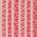 Julia 11925-19 Carnation, Moda Fabrics designed by Crystal Manning, 100% cotton, 43/44 inches wide. Red mixed fruit silhouettes stripes with alternating white leaf stripe on a pink carnation colored background.